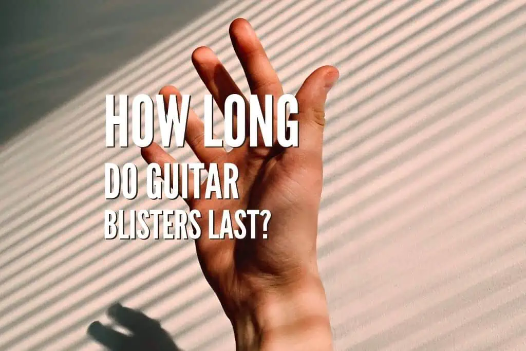 Guitar blisters result from the pressure and friction between the strings and fingertips, a common discomfort suffered by most guitarists at some point. They last from a few days to a week if cared for properly. But, the process can take up to two weeks if they transform into wounds for any reason, such as continuing playing or popping them out.